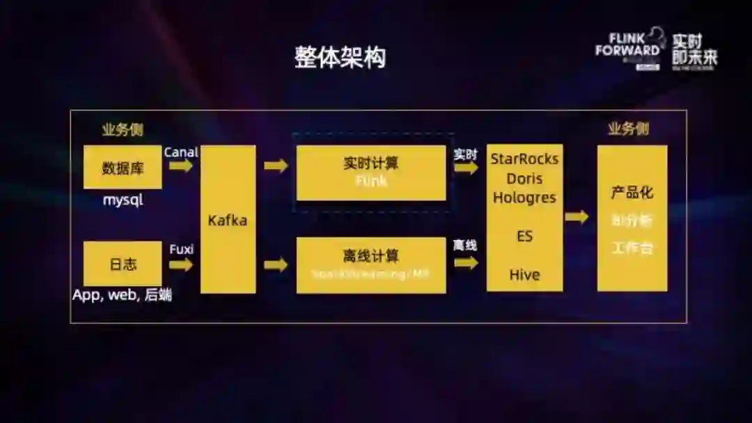 作业帮主要运用人工智能、大数据等技术,为学生提供更高效的学习解决方案。因此业务上的数据,主要是学生的到课情况、知识点掌握的情况这些。整体架构上,无论是 binlog 还是普通日志,经过采集后写入 Kafka,分别由实时和离线计算写入存储层,基于 OLAP 再对外提供对应的产品化服务,比如工作台、BI 分析工具。