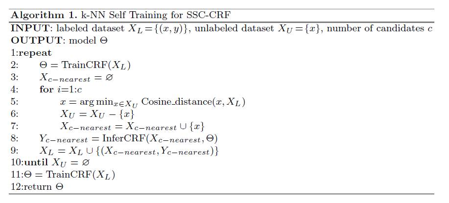 半监督学习算法框架:借鉴了KNN和self learning的思路,先有一部分标注,可以训练得到一个CRF,每次选出未标注中与现有集合最相似的序列进行标注,重新训练CRF,循环标注所有其他的序列