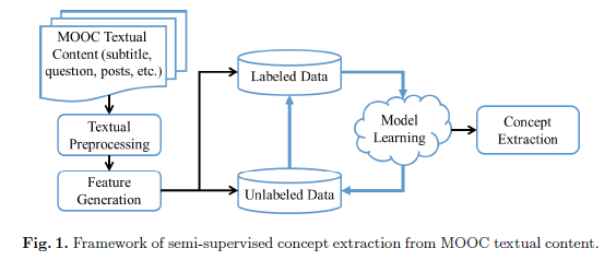 思路和研究意义:MOOC上的文本数据不完全是结构化的(例如视频字幕是有老师切分得到的,因此是结构化的,但论坛帖子是学生自发的,因此不是结构化的),所以需要用基于知识点的方式进行组织管理,进一步可以做concept map,跨领域知识分析以及个性化学习等工作。