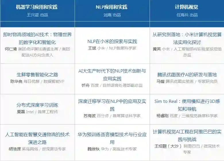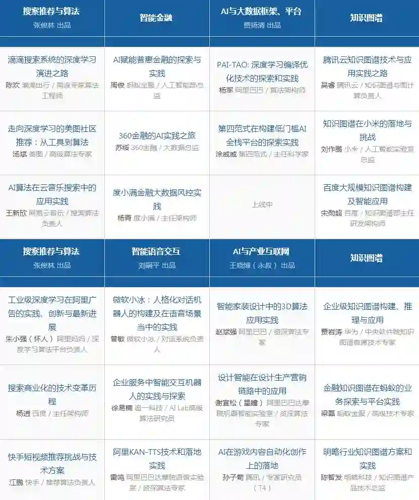 大会设置的技术专场包括:机器学习应用和实践、搜索推荐技术、计算机视觉、NLP、知识图谱、AI+大数据、AI+产业互联网、智能金融、智能语言交互等,下面我们来看下部分精彩议题: