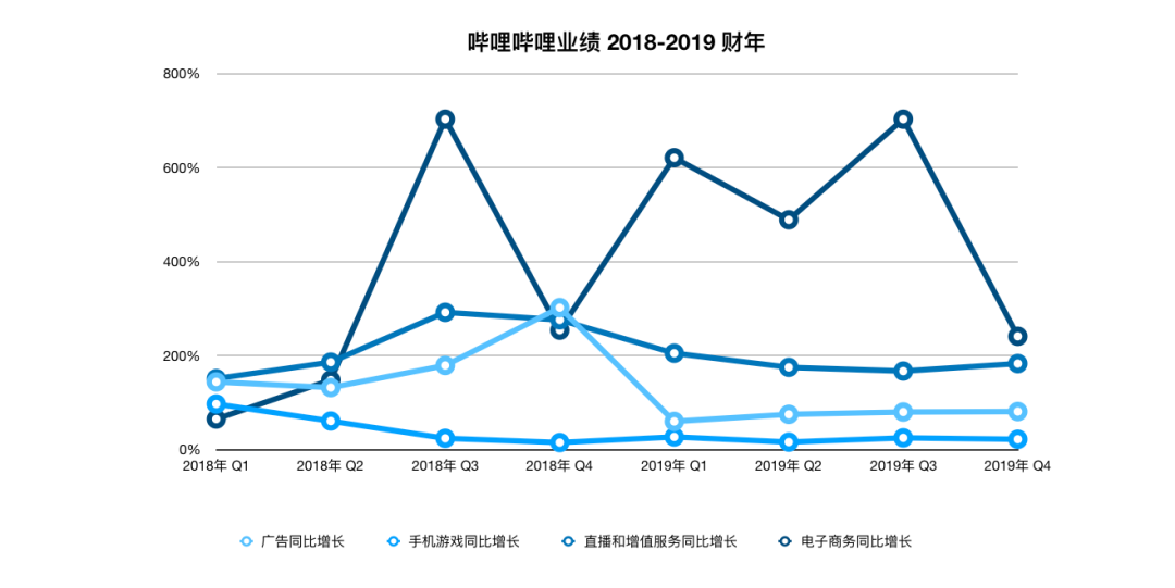 从2018年第一季度开始,B站的游戏业务增速开始下滑,且在2018年第二季度,直播、广告、电子商务的增长速度开始超过游戏。游戏业务增长乏力是一方面,更重要的是,B站认识到多元业务的重要性后开始发力。