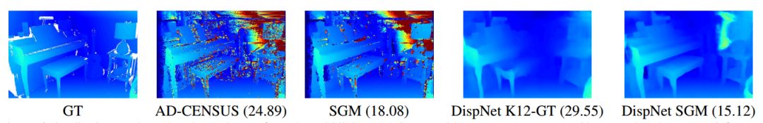 图2.数据库Middlebury 14中的PianoL图像的数值结果,其中括号中的数字为平均误差。从左到右:真实视差图(白点为未定义点),三种不同双目算法获取的视差图。