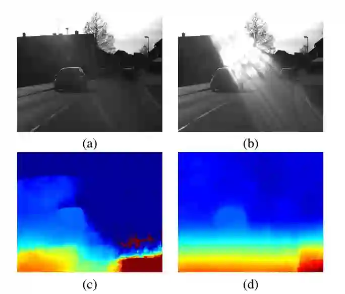 图1.非监督适应方法的有效性。(a)(b):左右图为不含真实值的数据库[11]中的双目图像对。(c):Dispnet-Corr1D的输出。(d):加入非监督适应方法的Dispnet-Corr1D的输出