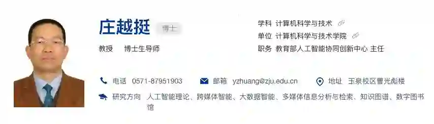 根据浙江大学官网,庄越挺是浙江大学计算机学院教授,国家杰出青年科学基金获得者(2005年)、“百千万人才工程”国家级人选者(2006年)、教育部长江学者特聘教授(2008年)、浙江省特级专家(2014年)、973首席科学家(2011年)、享受国家政府特殊津贴(2000年)、浙江省有突出贡献中青年专家(2013年)、浙江省“151人才工程”第一层次培养人员(2000年),教育部“网络多媒体智能信息处理技术”创新团队带头人。国务院学位委员会第七届学科评议组成员。中国人工智能学会(CAAI)会士(2018)、常务理事。浙江省计算机学会理事长。中国计算机学会(CCF)2018中国计算机大会(CNCC 2018)程序委员会主席。