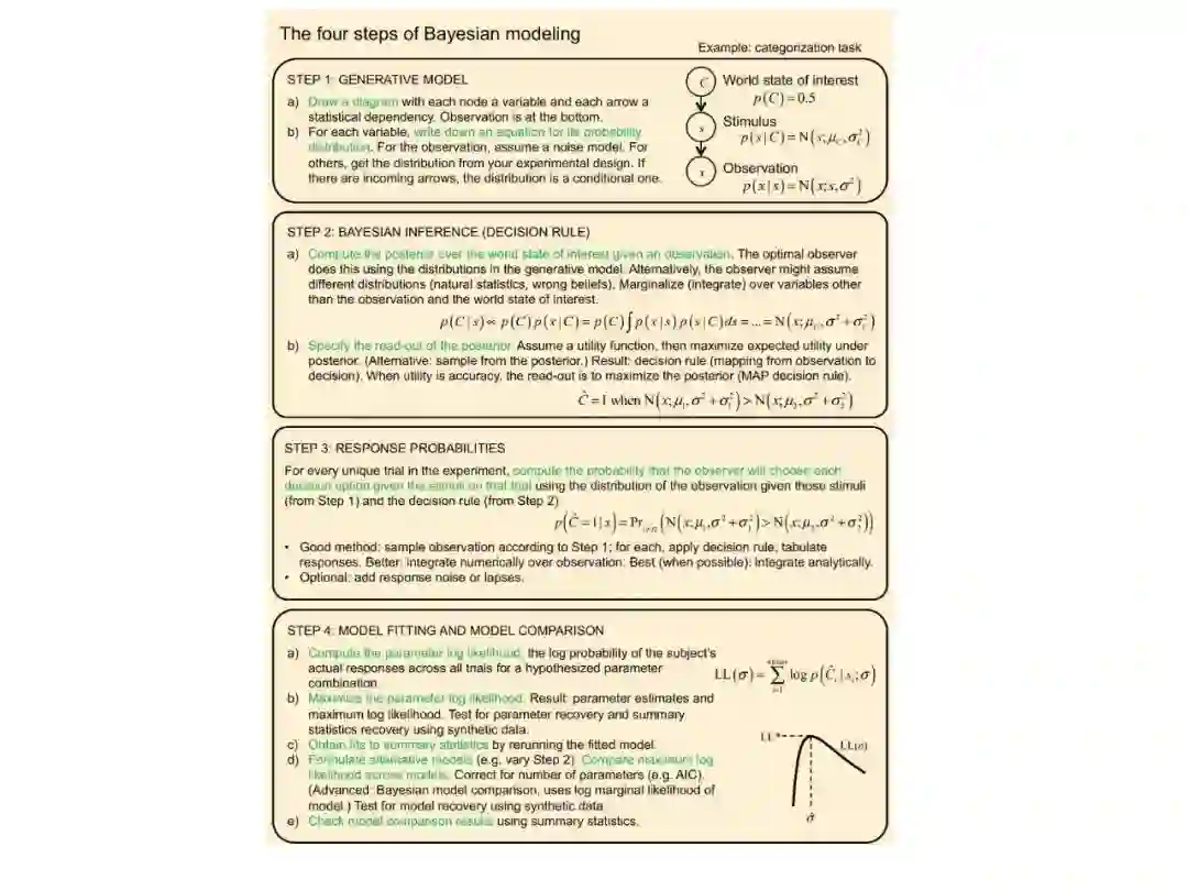 在本文中,详细讨论了贝叶斯行为建模的优势所在,将使用各种感知现象作为例子,同时分析用于贝叶斯建模任务的各种数学细节:似然比、nuisance参数、噪声度量、以及层次推理。我们将讨论模型拟合与比较技术,并仔细分析贝叶斯行为模型的优劣。