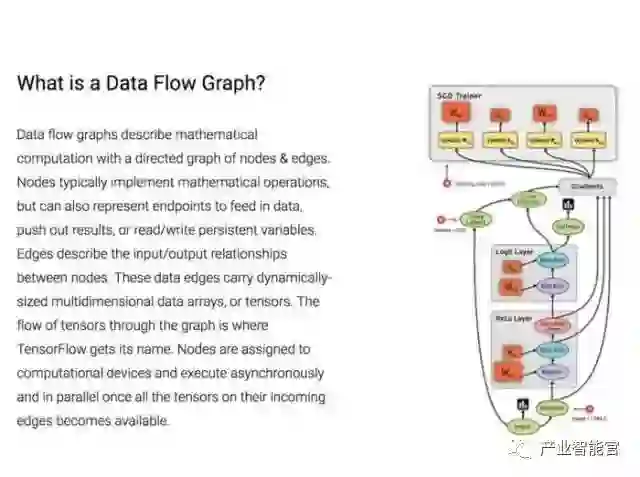 TensorFlow 实现了所谓的数据流图,其中的批量数据(“tensors”)可以通过图描述的一系列算法进行处理。系统中数据的移动称为“流”-其名也因此得来。这些图可以通过 C++ 或者 Python 实现并且可以在 CPU 和 GPU 上进行处理。