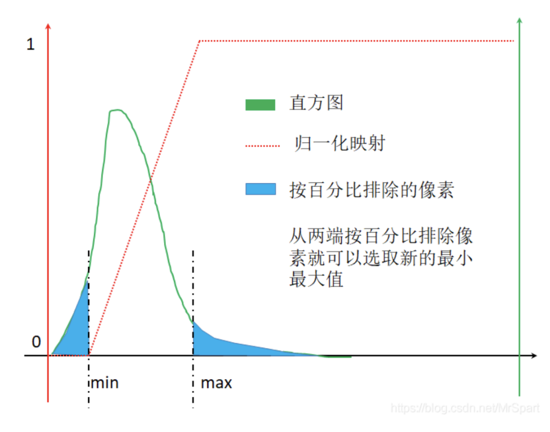 红色点虚线代表的映射其实挺简单的,选取合适的最小最大值,小于最小值的置为0,大于最大值的置为1,中间的线性映射。最大最小值的选取方法有均值+-x*标准差和排除两端一定占比的像素。排除两端一定占比的像素的示意图如下,从两端按照百分比排除像素时就能够选取新的最小最大值,此时的归一化映射图像为红色点虚线。