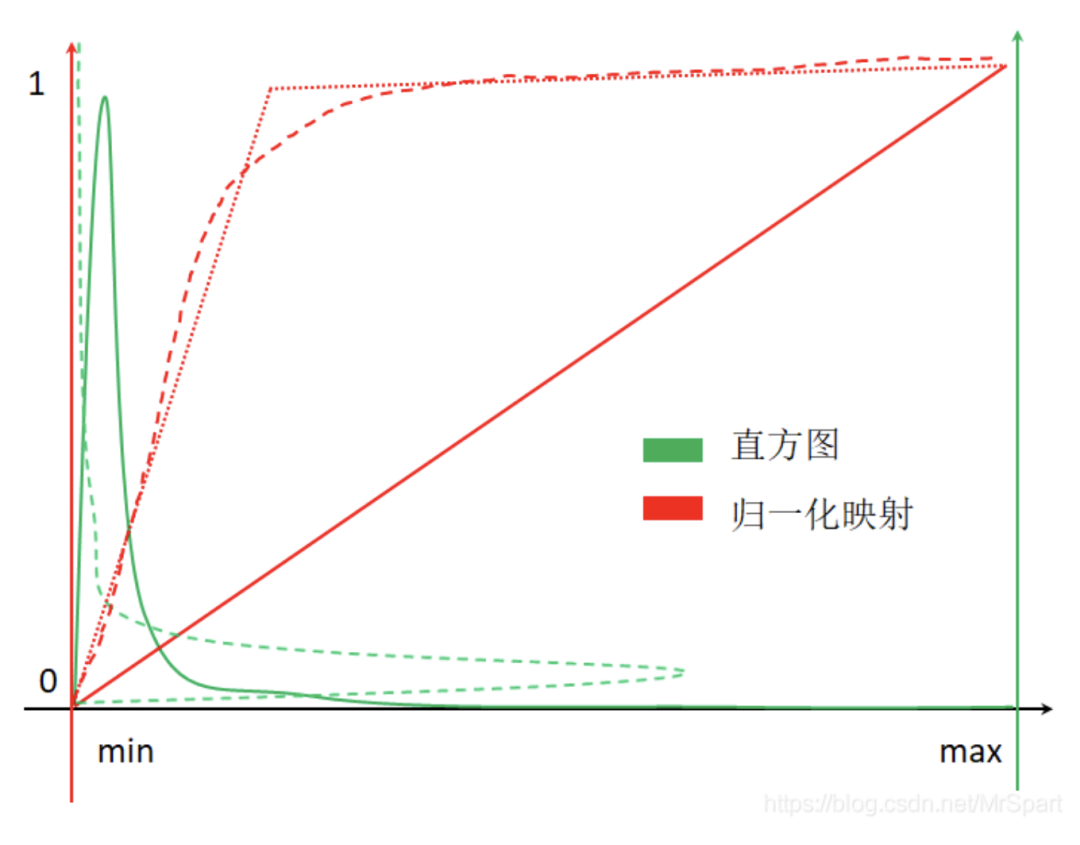 如果按照红色实线代表的归一化映射进行处理,最终绝大多少像素取值集中在0附近,整幅图像一片黑(翻转后的绿色虚曲线就是归一化后的直方图。最佳的处理方式是按照红色长线段虚线代表的映射进行归一化,但是这个映射难以求解,一般按照红色点虚线代表的映射进行处理就行。