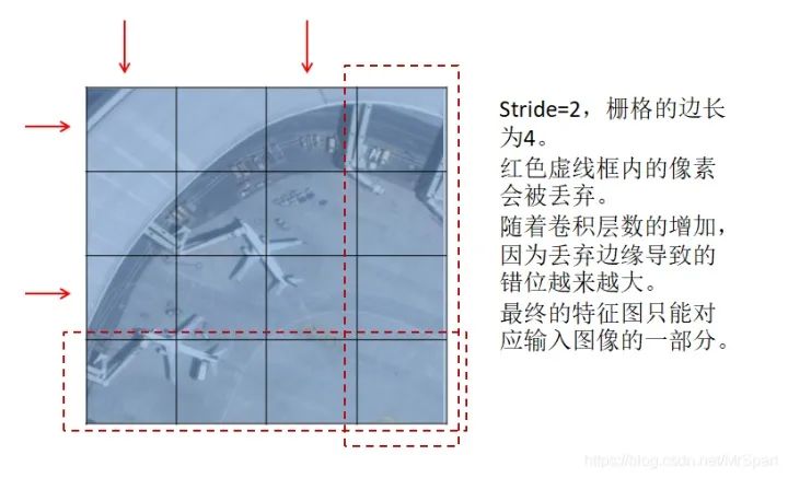 如果栅格的边长减去1后不能被stride整除,卷积的降采样过程会丢弃边缘的像素,结果是特征图像素与输入图像位置映射会产生偏移。最终的特征图是不能完整映射到输入图像范围的,拿一个错位的特征图像素去预测原图上的目标,想想都不靠谱。目前所有的深度学习框架都没有考虑这里的映射错位关系,就算用Mask-RCNN提供的ROIAlign也是错位的。