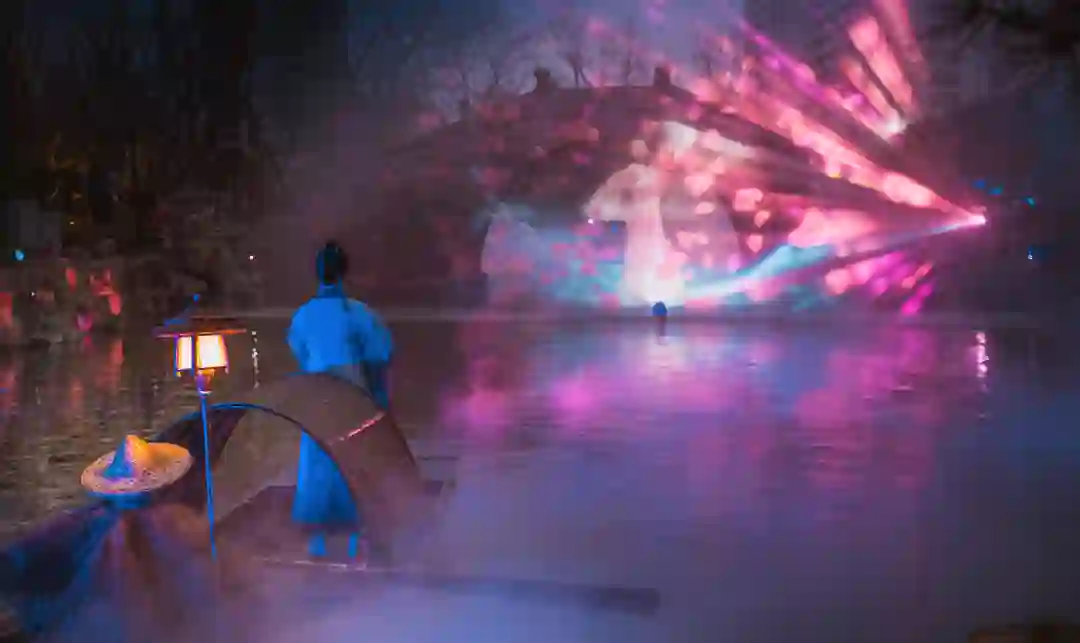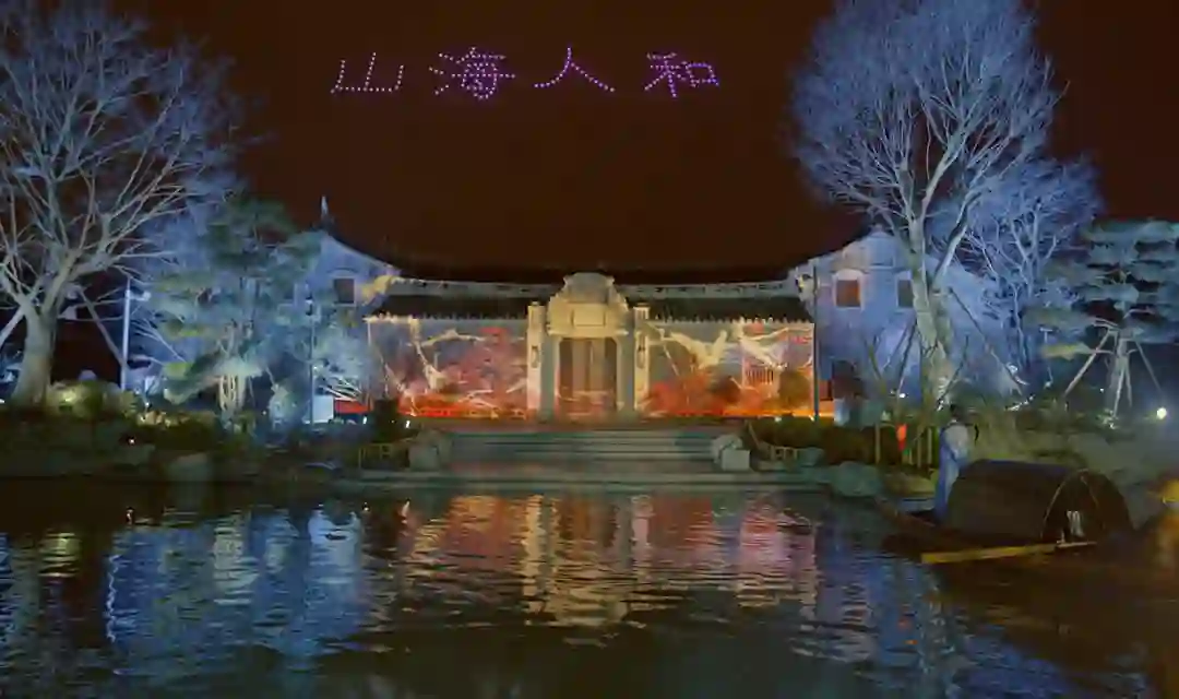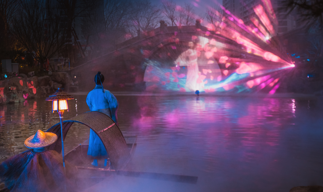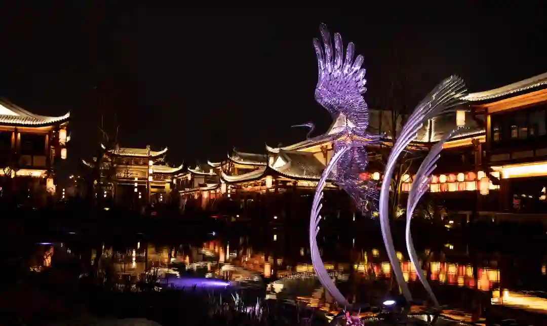 创新则体现在拈花湾文旅一贯擅长的打造「沉浸式体验」,如今,夜间的葭沚就是古代繁盛街景「平行时空的再现」,老街利用水域及文昌阁等场景,打造演艺产品、艺术雕塑、故事场景,传承文化同时利用艺术和现代科技,形成了有别于城市风貌的不同体验空间,瀑布、湿地、桥梁、牌坊、湖面、桥梁等景观节点次第展现。