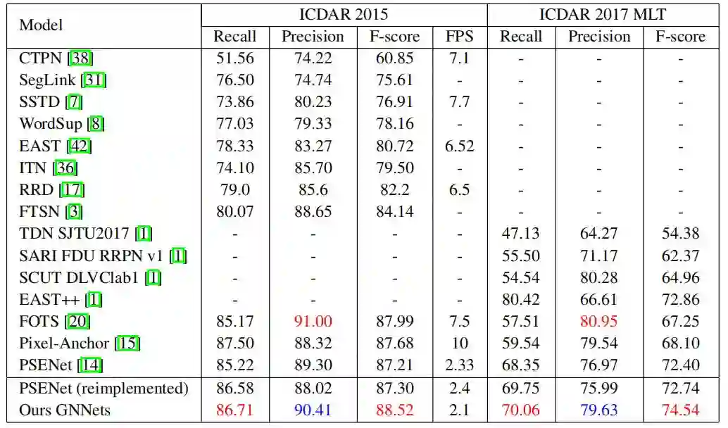 与原始的PSENet[2] 相比,作者提出的GNNets在ICDAR 2015[3]和ICDAR 2017 MLT [4]上分别实现了约1.3%和2.1%的性能提升。与ICDAR2015上的EAST[5]和ITN [6]相比,GNNet的F-score比它们分别高出8%和9%。与FTSN [7]相比,获得了4.5%的性能提升。GNNets在ICDAR 2015上的表现优于FOTS [8],在ICDAR 2017 MLT上的F-score更超出其7.3%。并且FOTS使用了文字识别的数据。在单尺度测试中,作者提出的GNNets在ICDAR 2015和ICDAR2017 MLT上均达到了state-of-the-art的性能。Fig. 5可视化了GNNets和其他文本检测方法在ICDAR 2015和ICDAR 2017 MLT上的检测结果。