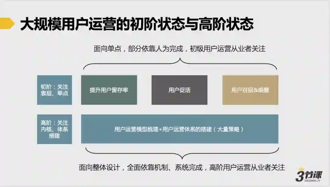 初阶段位下,我们解决的是某个单点的问题(比如如何通过一个活动提升用户活跃度,如何做好用户召回等),且很多时候仍然会要依赖于人为推动去解决这些问题(比如人为做个活动,或者写几条召回推送);