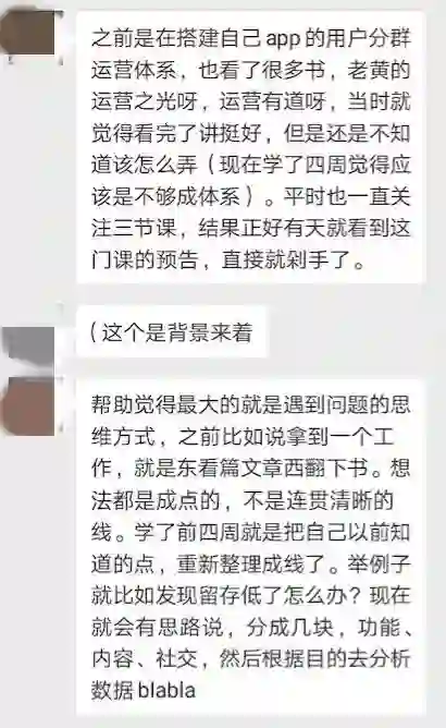 就我、张亮、韩叙三个人的目光之所及,这个课程是目前业内唯一一堂在如何做RFM用户分层、如何设计用户防流失+生命周期运营、如何搭建积分体系、如何通过策略设计长期用户召回机制、如何系统构建用户成长体系等诸多含金量超高的难点问题下都接近做到了可以手把手教你落地的课程。
