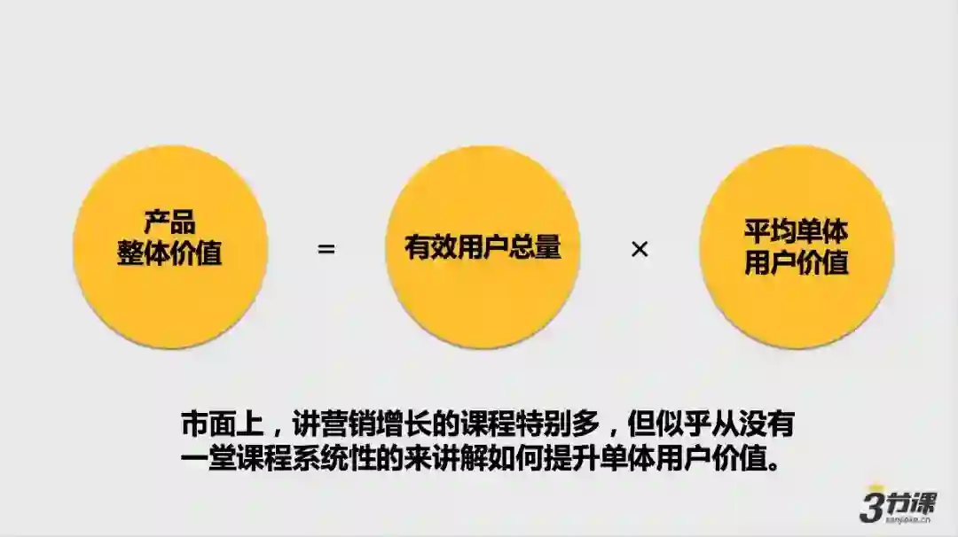 第一,运营的目的最终是为了提升一款产品的价值,而产品价值等于“用户量”与“单体用户价值”的相乘(如下图)。某种意义上,营销、推广、增长要解决的都是“如何提升用户量”的问题,而“用户运营”要解决的,就是如何提升“单体用户价值”的问题。