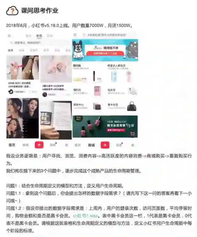 同时,为了最真实的让这个课程的学员能够掌握基于数据进行用户分层、生命周期管理、防流失等等工作方法,我们专门请了顶尖的程序员+数据分析师跑了上百万份数据出来,用于设计本门课程的实战训练作业。可以说,这门课程的实战训练作业,含金量一点也不亚于课程内容本身。下面可以给你展示其中一份课程中的作业,你可以感受一下: