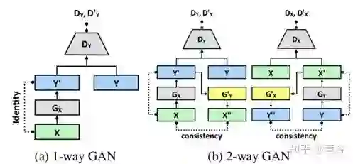 前面图(a)生成器作GX而图(b)鉴别器用作DY,得到以前图(a)单路GAN的架构。同样推广A-GAN可以得到如以前图(b)的双路GAN架构。
