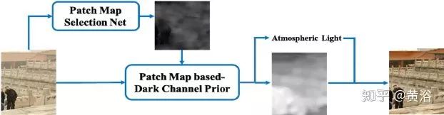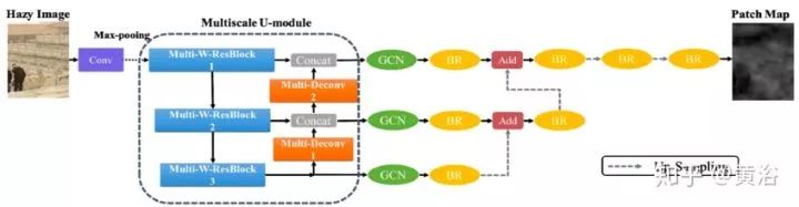 为了提高该网络的性能,PMS-Net提出一种有金字塔风格的多尺度U-模块。基于补丁图,可预测更精确的大气光和透射图。所提出的架构,可以避免传统DCP的问题(例如,白色或明亮场景的错误恢复),恢复图像的质量高于其他算法。其中,定义了一个名为补丁图(patch map)的来解决暗通道先验(DCP)补丁大小固定的问题。