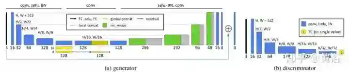 如图是GAN的生成器和鉴别器架构。生成器器基于U-Net,但添加全局特征。为了提高模型效率,全局特征的提取与U-Net的收缩部分共享前五层局部特征的提取。每个收缩步骤包括5×5滤波、步幅为2、SELU激活和BN。对全局特征来说,假定第五层是32×32×128特征图,收缩后进一步减小到16×16×128然后8×8×128。通过全连接层、SELU激活层和另一个全连接层,将8×8×128特征图减少到1×1×128。然后将提取的1×1×128全局特征复制32×32个拷贝,并和低级特征32×32×128之后相连接,得到32×32×256特征图,其同时融合了局部和全局特征。在融合的特征图上执行U-Net的扩展路径。最后,采用残差学习的思想,也就是说,生成器只学习输入图像和标注图像之间的差异。