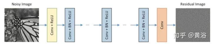 如图是DnCNN架构图。给定深度为D的DnCNN,有三种层。(i)Conv + ReLU:第一层,64个大小为3×3×c的滤波器生成64个特征图,然后是ReLU,这里c表示图像通道数,灰度图像c = 1,彩色图像c = 3。(ii)Conv + BN + ReLU:层2~(D-1),64个大小为3×3×64的滤波器,在卷积和ReLU之间添加BN。(iii)Conv:最后一层,c个尺寸3×3×64滤波器来重建输出。
