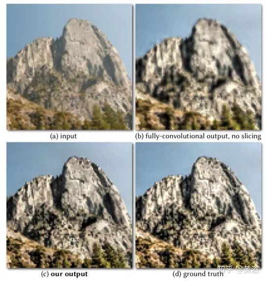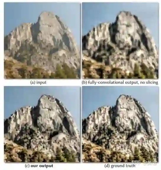 这是一种做图像增强的神经网络架构,其灵感来自双边网格处理(bilateral grid processing)和局部仿射颜色变换。基于输入/输出图像对,训练卷积神经网络来预测双边空间(bilateral space)局部仿射模型的系数。网络架构目的是学习如何做出局部的、全局的和依赖于内容的决策来近似所需的图像变换。输入神经网络是低分辨率图像,在双边空间生成一组仿射变换,以边缘保留方式切片(slicing)节点对这些变换进行上采样,然后变换到全分辨率图像。该模型是从数据离线训练的,不需要在运行时访问原始操作。这样模型可以学习复杂的、依赖于场景的变换。