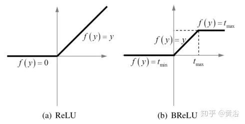4) 非线性回归:非线性激活函数的标准选择包括Sigmoid和ReLU;前者容易受到梯度消失的影响,导致网络训练收敛缓慢或局部最优;为此提出了ReLU ,一种稀疏表示方法;不过,ReLU仅在值小于零时才禁止输出,这可能导致响应溢出,尤其是在最后一层;所以采用一种BReLU激活功能,如图所示;BReLU保持了双边约束(bilateral restraint)和局部线性;这样,第四层特征图定义为