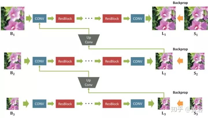 用ResBlocks堆叠足够数量的卷积层,每个尺度的感受野得以扩展。在训练时,将输入和输出高斯金字塔补丁的分辨率设置为{256×256,128×128,64×64}。连续尺度之间的比例(scale ratio)是0.5。对所有卷积层,滤波器大小为5×5。因为模型是全卷积,在测试时补丁大小可能变化。