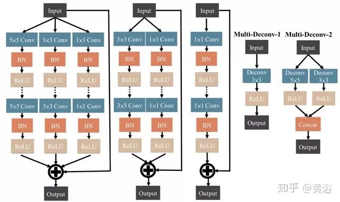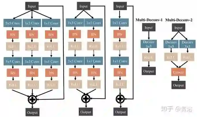 多尺度U-模块中的其他部分,Multi-Deconv模块将信息与MSWR而不是反卷积的输出连接在一起,因为反卷积层可以帮助网络重建输入数据的形状信息。因此,通过多尺度反卷积组合,可以从网络前层重建更精确的特征图。此外,Multi-Deconv执行金字塔风格并提高尺度与MSWR连接。也就是说,不同层特征图以不同的尺度运行去卷积(参见多尺度U-模块图右侧)。