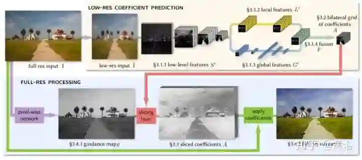 如图所示,对低分辨率的输入I的低分辨率副本I~执行大部分推断(图顶部),类似于双边网格(bilateral grid)方法,最终预测局部仿射变换。图像增强通常不仅取决于局部图像特征,还取决于全局图像特征,如直方图、平均强度甚至场景类别。因此,低分辨率流进一步分为局部路径和全局路径。将这两条路径融合在一起,则生成代表仿射变换的系数。