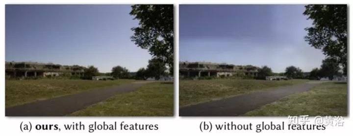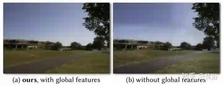 如图所示,全局特征路径允许模型推理完整图像,(a)例如再现通过强度分布或场景类型的调整。(b)如果没有全局路径,模型可以做出空间不一致的局部决策。
