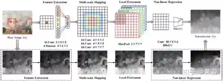DehazeNet是一个可训练的端到端系统,用于介质传输估计。DehazeNet将雾图像输入,输出其介质传输图,随后通过大气散射模型(atmospheric scattering model)恢复无雾图像。DehazeNet采用CNN的深层架构,设计能体现图像去雾的假设/先验知识。具体而言,Maxout单元层用于特征提取,几乎所有与雾相关的特征。还有一种新的非线性激活函数,称为双边整流线性单元(Bilateral Rectified Linear Unit,BReLU),提高图像的无雾恢复质量。
