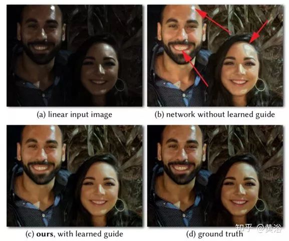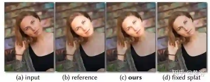 下面可以从一些例子看到各个改进的效果。如图所示,低级卷积层具备学习能力,可以提取语义信息。用标准双边网格的喷溅操作(splatting operation)替换这些层会导致网络失去很大的表现力。