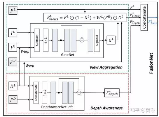 最后,连接原始左图特征FL,视角聚合特征FLviews和深度觉察特征FLdepth生成融合的左视角特征FLfuse。然后,将FLfuse供给DeblurNet的解码器。同理,采用FusionNet一样的架构可以得到右视角的融合特征。