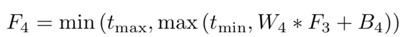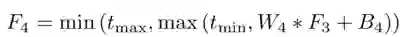 这里W4 = {W4}包含一个大小为n3×f4×f4的滤波器,B4 = {B4}包含一个偏差,tmin, max是BReLU的边际值(tmin = 0和tmax = 1) 。根据上式,该激活函数的梯度可以表示为