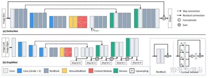 DeblurNet的结构基于U-Net,如图(a)所示。用基本残差模块作为构建块,编码器输出特征为输入尺寸的1/4×1/4。之后,解码器通过两个上采样残差块全分辨率重建清晰图像。在编码器和解码器之间使用相应特征图之间的跳连接(skip-connections)。此外,还采用输入和输出之间的残差连接。这使网络很容易估计模糊-尖锐(blurry-sharp)图像对之间的残差并保持颜色一致性。还有,在编码器和解码器之间使用两个空洞残差(atrous residual)块和一个Context模块来获得更丰富的特征。DeblurNet对两个视图使用共享权重。