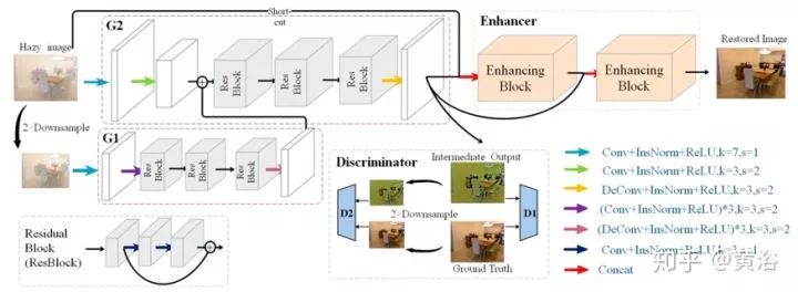 论文将图像去雾问题简化为图像到图像的转换问题,并提出增强的Pix2pix去雾网络(EPDN),它可以生成无雾图像,而不依赖于物理散射模型。EPDN由生成对抗网络(GAN)嵌入,然后是增强器。一种理论认为视觉感知是全局优先的,那么鉴别器指导生成器在粗尺度上创建伪真实图像,而生成器后面的增强器需要在精细尺度上产生逼真的去雾图像。增强器包含两个基于感受野模型的增强块,增强颜色和细节的去雾效果。另外,嵌入式GAN与增强器是一起训练的。