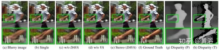如图显示的是视差对去模糊的作用:(a)(f)(g)和(h)分别表示模糊图像、清晰图像、预测的视差和GT视差。(b)和(e)是单目去模糊网络DeblurNet和双目去模糊网络DAVANet的结果。在(c),两个左图像输入,DispBiNet不能为深度觉察和视角聚合提供任何深度信息或视差。在(d)中,为了消除视角聚合的影响,不会从FusionNet中其他视图变形该特征。由于该网络可以准确估计和采用视差,因此其性能优于其他方法