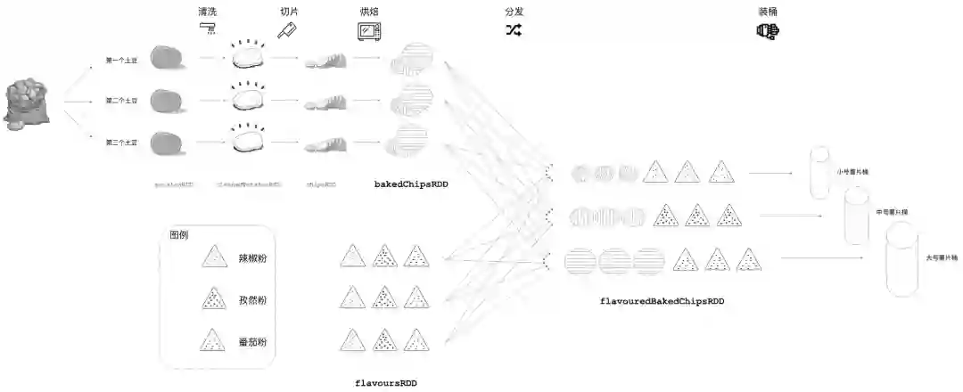 不过,工业应用中的 Spark DAG 要比这复杂得多,往往是由不同 RDD 经过关联、拆分产生多个分支的有向无环图。为了说明这一点,我们还是拿土豆工坊来举例,在将“原味”薯片推向市场一段时间后,工坊老板发现季度销量直线下滑,老板心急如焚、一筹莫展。此时有人向他建议:“何不推出更多风味的薯片,来迎合大众的多样化选择”,于是老板一声令下,工人们对流水线做了如下改动。