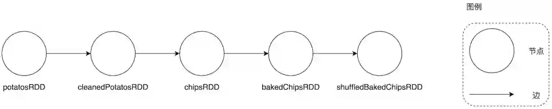 为了回答这些问题,我们需要先对于 DAG 的“首”和“尾”进行如下定义:在一个 DAG 中,没有父 RDD 的节点称为首节点,而没有子 RDD 的节点称为尾节点。还是以土豆工坊为例,其中首节点有两个,分别是 potatosRDD 和 flavoursRDD,而尾节点是 flavouredBakedChipsRDD。