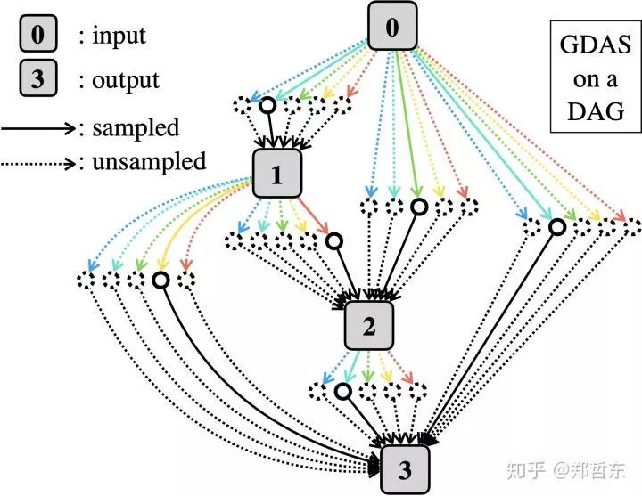 神经网络搜索(neural architecture search, NAS)是现在非常热门并且具有挑战性的一个方向。目前大部分NAS方法都是基于强化学习或者遗传算法,需要消耗海量的GPU资源。这篇论文提出了一种利用可微网络结构采样器的基于梯度的搜索方法(Gradient-based search using Differentiable Architecture Sampler,GDAS)能够有效地减少搜索的GPU资源消耗。GDAS将整个搜索空间用一个有向无环图(DAG)来表示。针对这个DAG,GDAS设计了一个可微的采样器,GDAS在训练集上优化DAG内每个网络结构的参数,在验证集上优化这个可微的神经网络采样器。实验表明,在一个GPU上,通过几个小时的搜索时间,GDAS就可以在CIFAR-10数据集上找到一个高性能的网络结构。