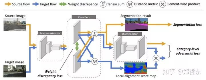 基于深度学习的语义分割方法效果出众,但需要大量的人工标注进行监督训练。借助于计算机虚拟图像技术,如3D游戏,可以获得几乎无限的自动标注数据。然而虚拟图像和现实图像间存在严重的视觉差异(域偏移),导致训练出的模型在真实图像数据集上的分割精度很低。传统方法利用对抗训练减少源域(S)和目标域(T)不同分布之间的差异,以加强网络在域间的泛化能力。然而该类方法只能对齐全局特征分布,忽略了同语义特征之间的语义一致性,在训练过程中容易造成负迁移。针对这一难点,作者采用了Co-training + Adversarial Training的方式,使用两个互斥分类器,根据分类器预测的差值来估计源域和目标域中特征的局部语义对齐程度,以此动态计算针对每类特征的对抗损失权重,解决了域适应语义分割中的语义不一致性问题和负迁移问题。