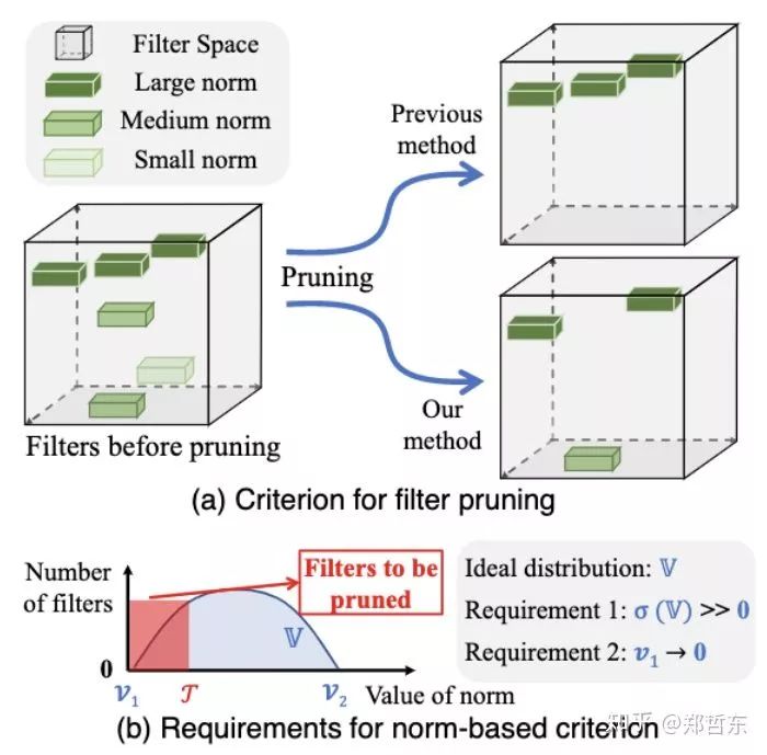 本文提出了新的基于滤波器的几何中心(geometric median)的剪枝算法,来对神经网络进行压缩和加速。现有的剪枝算法普遍认为,范数(Lp-norm)小的滤波器可以被去掉而不影响网络性能。由此对滤波器的范数有两个要求,一是滤波器范数分布的标准差要大,二是最小的范数要足够小。但是实际的经过预训练神经网络模型并不满足这两个要求,这导致一些重要的滤波器被错误地剪掉,影响了性能。本文从几何的角度出发,认为滤波器的几何中心含有所有滤波器共同的信息,因此临近几何中心的滤波器是可以被去掉的。这种新的剪枝方法,打破了以前的剪枝算法对滤波器范数的要求,提高了剪枝算法的适应性和并且取得了更好的性能。