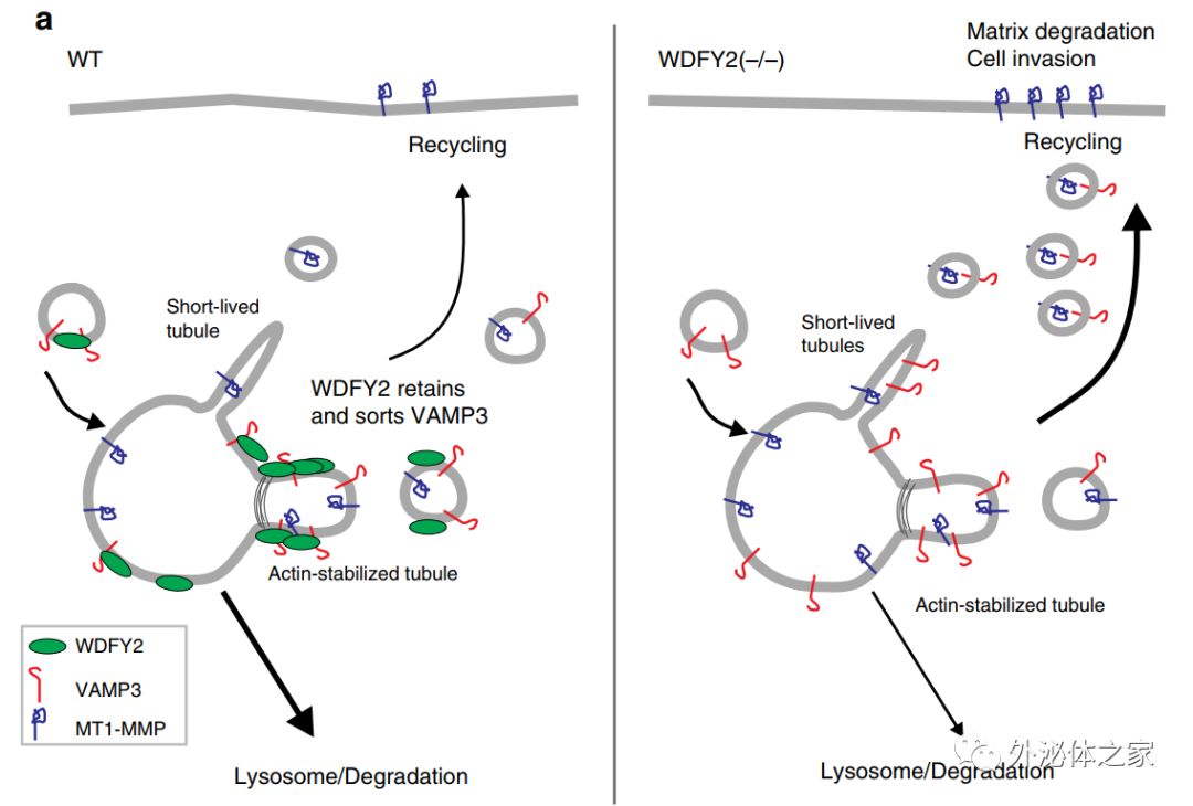 该研究显示WDFY2通过控制v-SNARE VAMP3的内体分选来调节MT1-MMP的胞吐作用。WDFY2定位于对小GTP酶RAB4呈阳性的肌动蛋白稳定的内体小管,并且显示出对富含脂质磷脂酰肌醇3-磷酸(PtdIns3P)的高度弯曲的膜的偏好。在这里,它与VAMP3相互作用,VAMP3指导内体衍生的货物(包括MT1-MMP)的分泌。WDFY2的敲除导致MT1-MMP的分泌增加并且允许细胞主动侵入ECM。