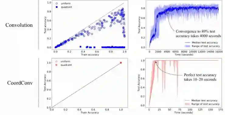 图9 如前所述,反卷积在监督坐标分类任务上表现的马马虎虎,但是 CoordConv 却在训练集和测试集上都取得了 100% 的正确率。并且解决方案明显更简单了。