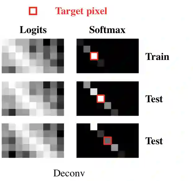 图5 对几个相邻像素的预测。网络在训练集上的准确率是完美的,但是在测试集上只有 86%,更令人惊讶的是,大多数测试集像素几乎都被训练集像素包裹着。此外,从可视化结果来看,网络在训练集上的结果也不是那么完美,因为目标像素周围还存在一些误判。