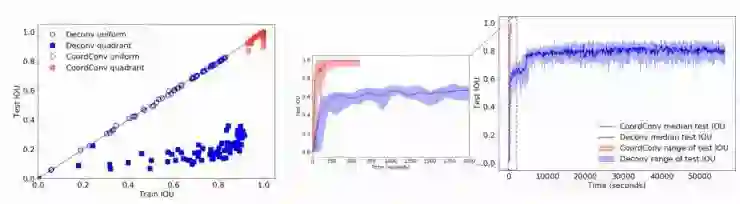 我们假设卷积神经网络可以轻松地解决这个任务,因为这个任务非常简单(我们的论文展示了整个数据集的生成只需要两行 Python 代码),同时由于这个数据集非常小,模型很容易就过度参数化。但事实证明,卷积神经网络的表现十分糟糕。即使是具有多达 1M 个参数且训练时间超过 90 分钟的模型(图2b),也无法在均匀分割的测试集上获得超过 0.83 的 IOU 性能,而在象限分割的测试集上则无法超过 0.36 的 IOU(图2a)。