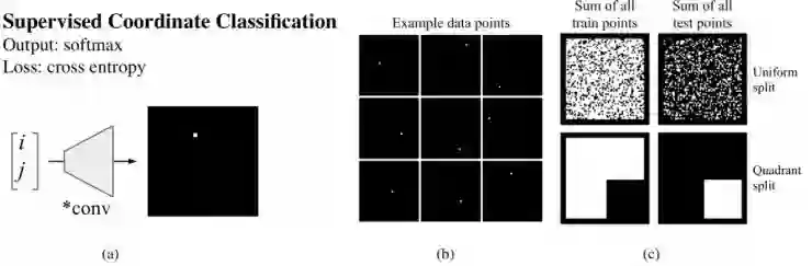 让我们来缩小任务的范围,以便于能够发现问题所在。我们现在的任务是要求网络绘制一个简单的像素(而不是 9*9 的正方形)。因为我们很容易就会想到,如果模型可以解决这个单像素任务,那么通过堆叠更深的反卷积网络就可以很容易地将这个像素扩展成一个更大的正方形,这也是我们通过实验验证过的直觉。因此,我们想到了这个基于监督的坐标分类任务(图3a),其中数据集由成对的 (i, j) 坐标和图像(对应的像素点被激活)组成,如下图 3b。