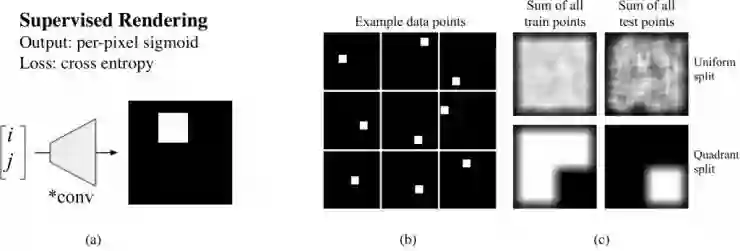 其中一种策略是,我们可以采用当前生成图像的主流方法来实现这项任务,即通过堆叠反卷积(转置卷积)层来生成图像以及绘制正方形。为了验证这个想法,我们创建一个由 64*64 大小的画布(图像)组成的数据集,这些画布上随机地绘制了 9*9 的正方形格子,如下图1 (b) 所示。通过枚举所有可能的情况(保证正方形完整的前提下),我们总共得到了 3136 个样本。然后为了评估模型的泛化能力,我们定义两种训练/测试集分割方法:均匀分割法,这种方法将所有可能的正方形中心位置按 8:2 的比例随机地分成了训练集与测试集;另一种是象限分割法,这种方法将画布划分成了四个象限,其中正方形中心位于前三个象限的画布被分配进训练集,而正方形中心位于第四象限的画布被分配进测试集。这两种分割法所产生的数据集分布如下图1 (c) 所示。