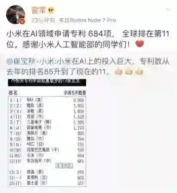 36氪讯,小米CEO雷军转发小米集团副总裁、小米技术委员会主席崔宝秋的微博时表示,小米在AI领域申请专利684项,全球排在第11位。