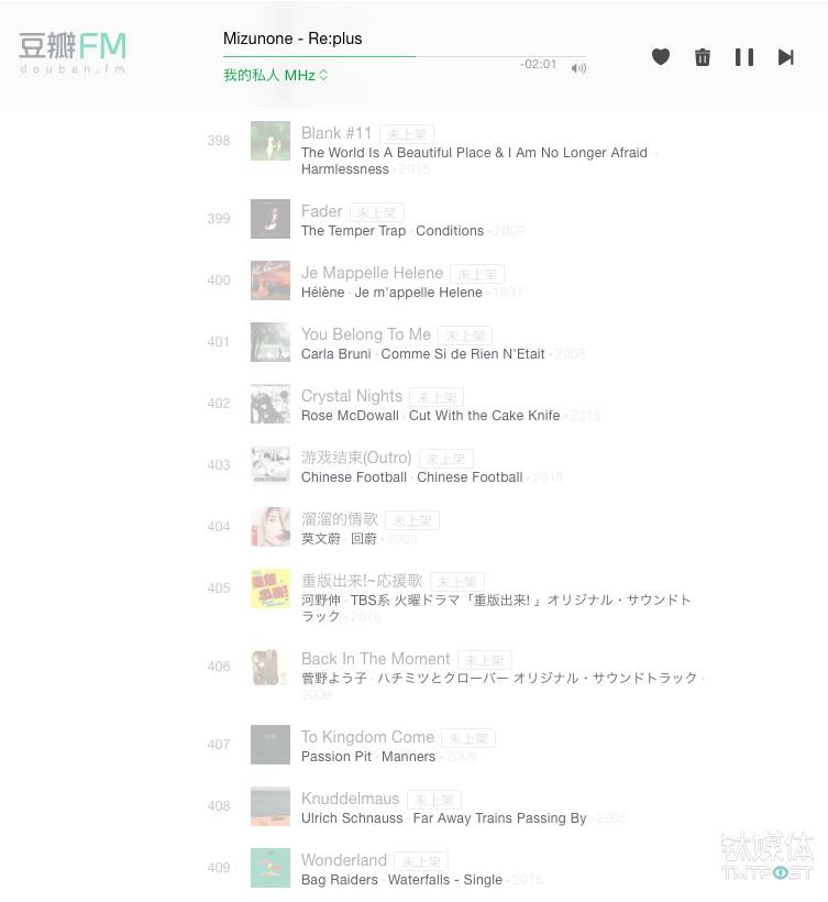 记者在豆瓣FM标注过的1571首红心歌曲中,只剩下了397首