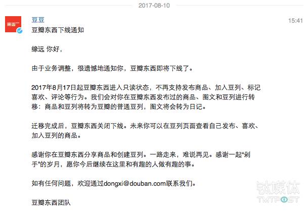 8月10日,一封《豆瓣东西下线通知》躺在豆瓣用户的站内信箱里,宣告了“豆瓣东西”的死亡。